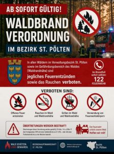 ⚠️ Waldbrandverordnung der Bezirkshauptmannschaft St. Pölten (ab 21.04.2026) Aufgrund erhöhter Waldbrandgefahr gilt: 🔥 Rauch- und Feuerverbot in Wäldern und in Waldnähe 💸 Wer dagegen verstößt,