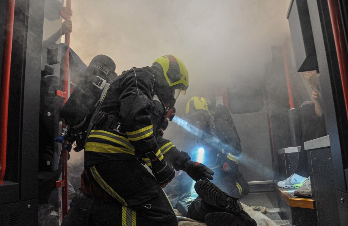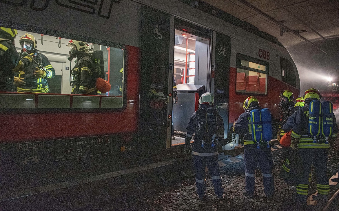 Simuliert wurde ein Brand in einem „CityJet“ durch einen defekten E-Scooter – mit starker Rauchentwicklung und notwendiger Evakuierung der Fahrgäste.