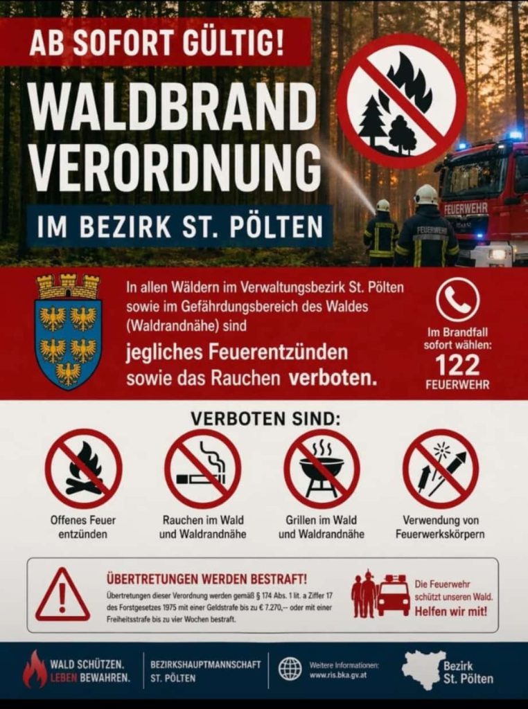 ⚠️ Waldbrandverordnung der Bezirkshauptmannschaft St. Pölten (ab 21.04.2026)