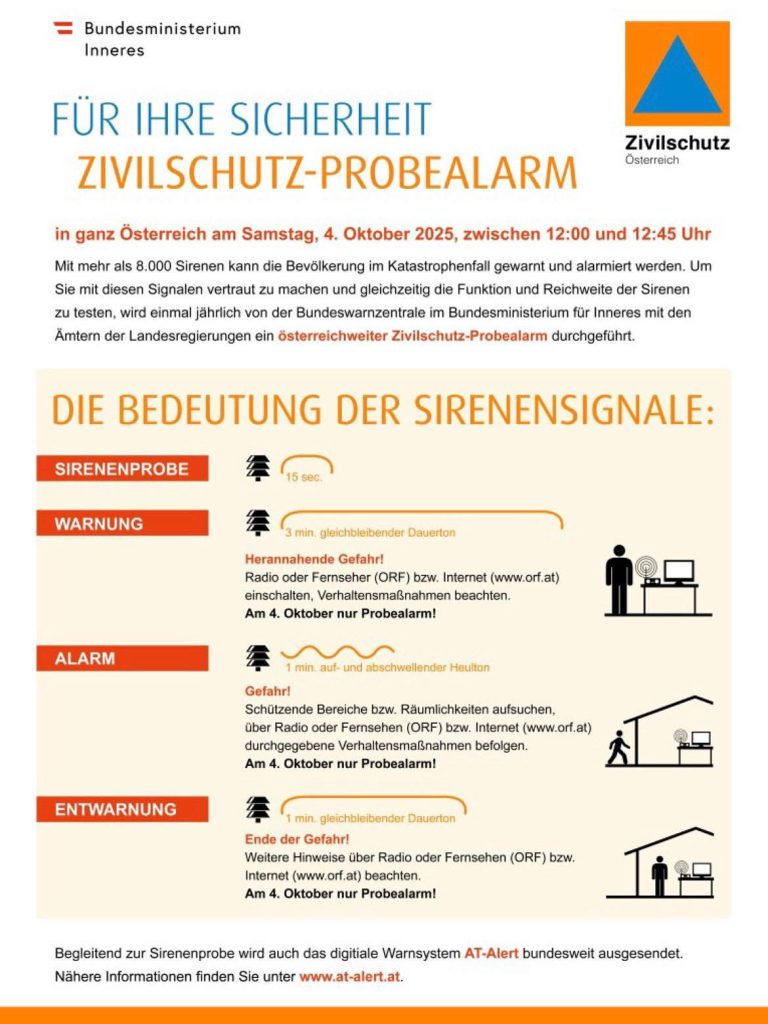 📅 Samstag, 4. Oktober 2025, 12:00–12:45 Uhr: In ganz Österreich werden über 8.000 Sirenen getestet.